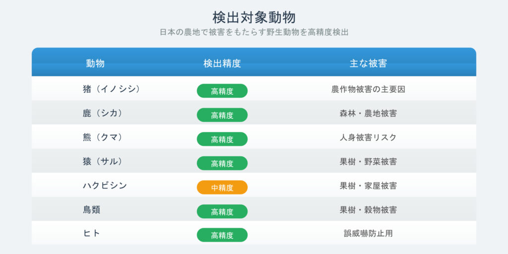 - 専用学習モデル: 日本の野生動物6種に特化した高精度検出