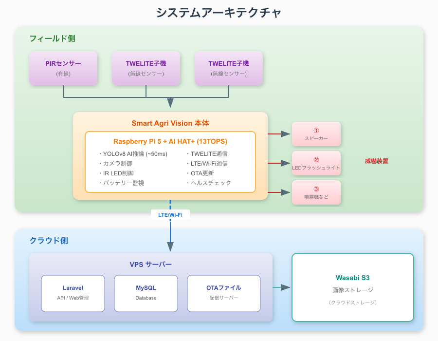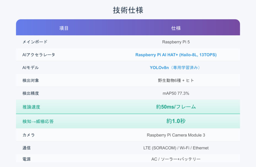 Smart Agri Visionは、最新のエッジAI技術を活用した野生動物自動検知・威嚇システムです。Raspberry Pi AI HAT+(13TOPS NPU)とYOLOv8ベースの専用学習モデルにより、検知から威嚇まで約1秒の超高速レスポンスを実現しました。