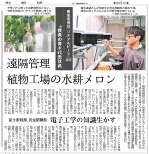 山形県内初となります閉鎖循環型水耕栽培によるメロンの様子が、6月17日に河北新報様へ掲載されました。 2年前にも掲載頂き、続報の形でご紹介頂きました。 詳しくは以下オンライン記事にてご覧ください。 https://kah […]